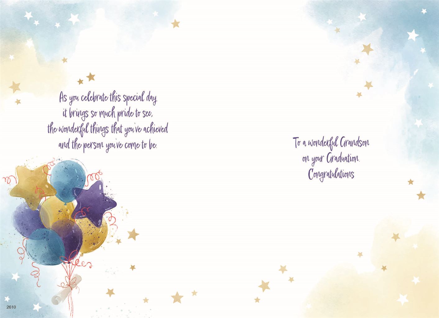 As you celebrate this special day it brings so much pride to see, the wonderful things that you've achieved and the person you've come to be. To a wonderful grandson on your graduation. Congratulations.