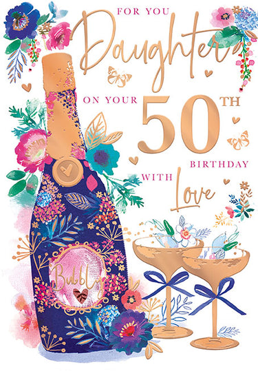 Greeting card with a champagne bottle and floral design, celebrating a 50th birthday for a daughter.