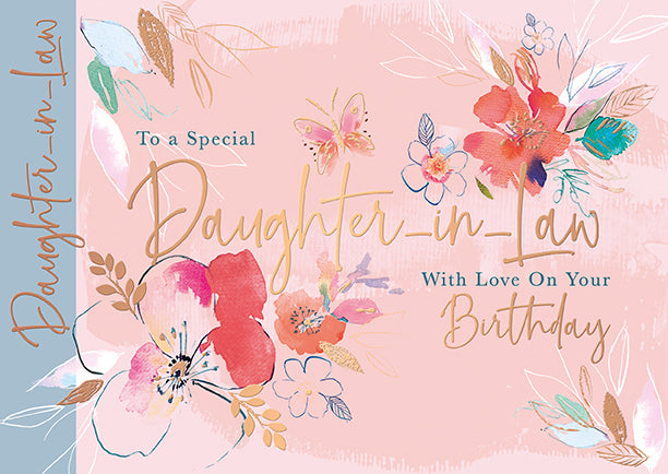 Stunning Daughter In Law Birthday Card. Featuring a pastel floral design and printed on quality card.