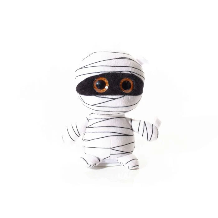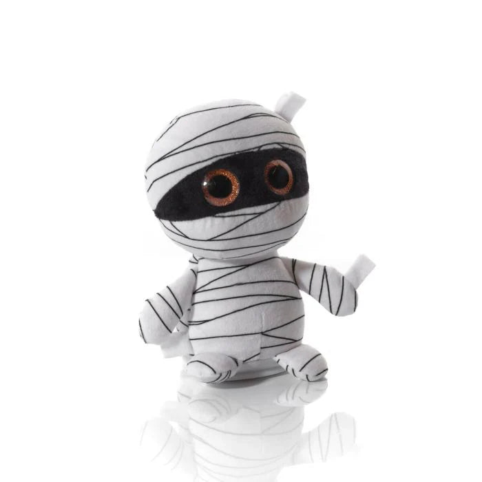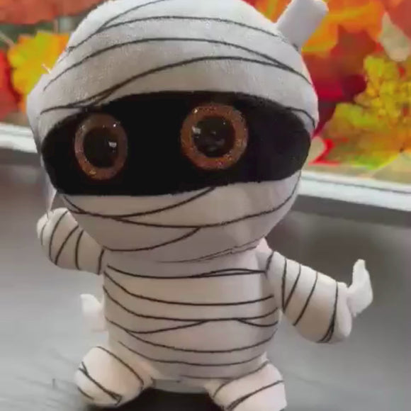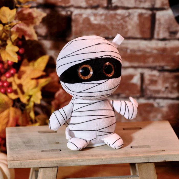 Bring spooky fun to life with the Spooktacular Talking Back And Shaking Mummy. Crafted from soft white and black fabric with stitched details, this plush mummy features large, captivating orange and black eyes and movable fabric arms and legs. Its traditional wrapped bandage design and rounded shape make it a perfect cuddly companion for Halloween or year-round play. Press to hear it talk and watch it shake, adding an interactive thrill that delights kids and collectors alike.
