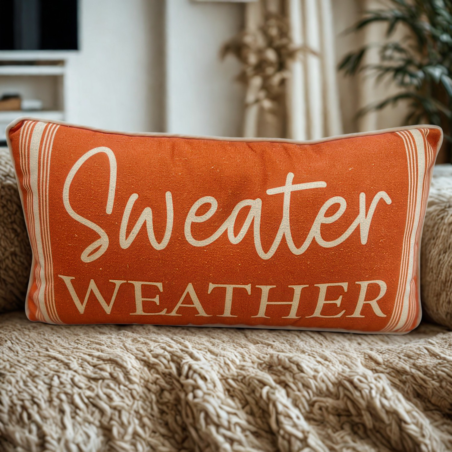 Bring the cosy vibes of autumn into your home with this warm-toned “Sweater Weather” cushion. Featuring bold lettering on a rustic burnt-orange background with striped edges, it’s the perfect seasonal accent for your sofa, bed, or favourite reading chair.
