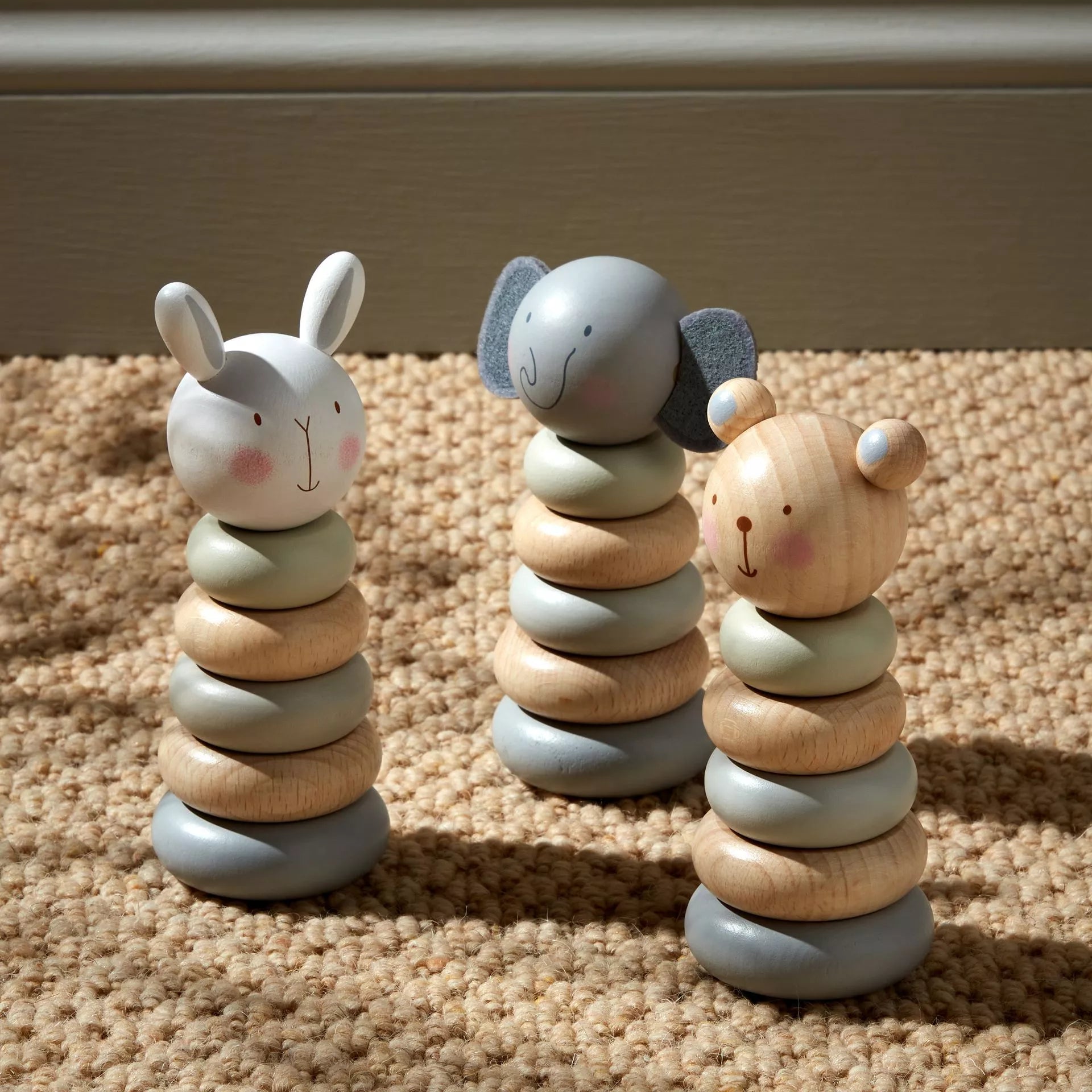 A tower stacking game from BAMBINO BY JULIANA®. These traditional stacking games showcase contemporary features for a new generation. The wooden games feature a matt finish to their neutral colours. Each one of the three designs available (bear, elephant and rabbit) features a loveable character head, complete with five stacking rings which are designed to develop problem solving and coordination skills for babies.