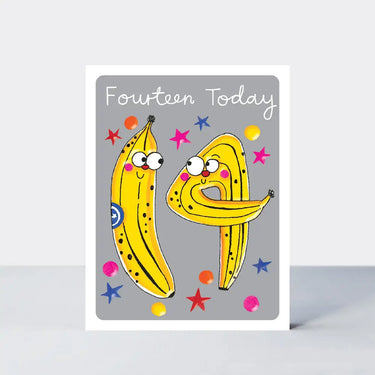 A children's age 14 card in a new small format. The card features funny bananas characters in the shape of a number 14. Printed on textured board with vibrant inks, the cards are finished with spot UV highlights and packaged with soft neutral coloured envelopes. Size: 130mm x 100mm Finish: Spot UV