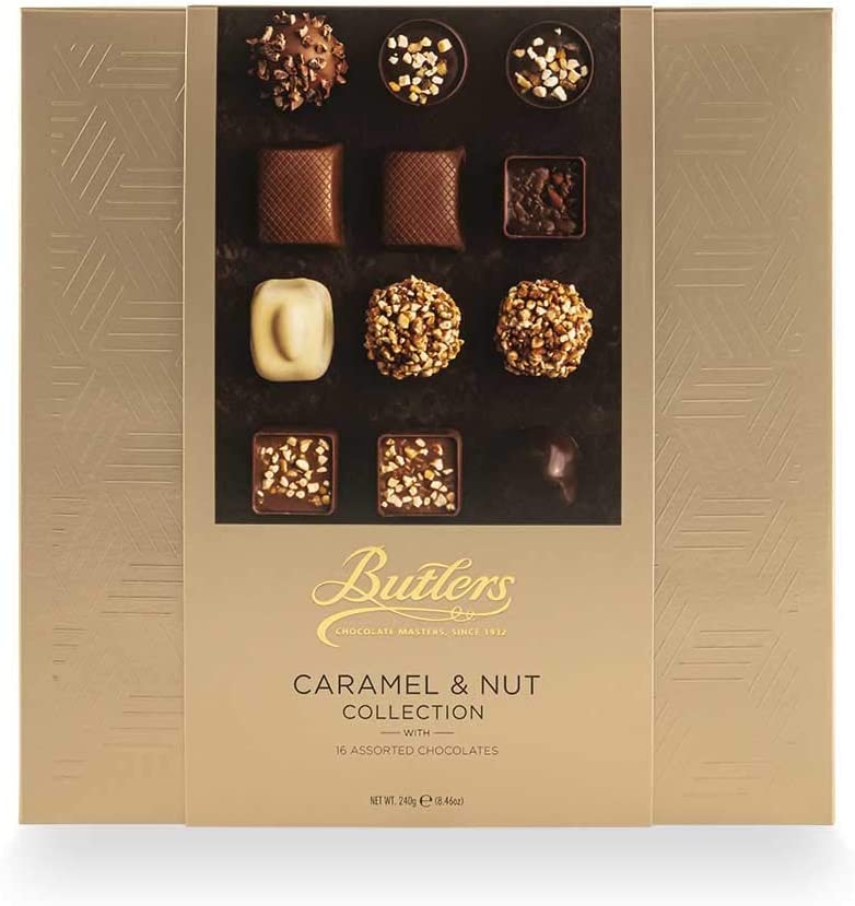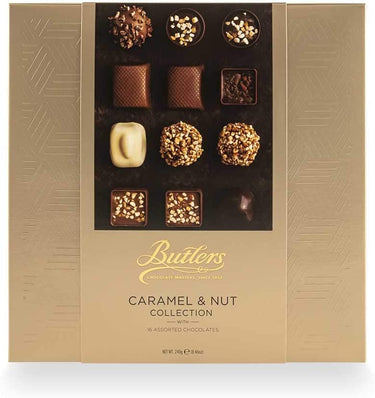 Ingredients Sugar, glucose syrup, cocoa mass, cocoa butter, whole MILK powder, sweetened condensed MILK (MILK, sugar), butter (MILK), invert sugar syrup, ALMONDS (NUTS) (4.95%), HAZELNUTS (NUTS) (2.7%), dark muscovado sugar, water, butterscotch pieces (brown sugar, glucose syrup, butter (MILK), palm oil), butter oil (MILK), emulsifier: SOYA lecithin, sunflower oil, natural flavourings, cocoa nibs, desiccated coconut, Sea Salt, Himalayan rose pink crystal salt, emulsifier: mono- and diglycerides of fatty acids, coffee powder, salt, preservative: sorbic acid. (MILK chocolate contains: 32% cocoa solids minimum, 20% MILK solids minimum. Dark chocolate contains: 58% cocoa solids minimum. White chocolate contains: 26% cocoa solids minimum, 20% MILK solids minimum). Please store in a cool, dry and odourless place. For best before date, please see side/base of box. There is no alcohol in this selection, which contains 16 chocolates. This product is vegetarian.