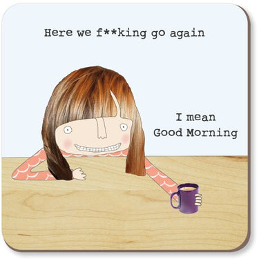 Matt finish coaster with cork backing. 'Here we f**king go again. I mean good morning.'