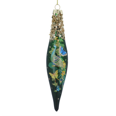 Add a touch of opulence to your holiday décor with this Luxury Peacock Glass Christmas Ornament. Beautifully hand-painted in rich green, gold, and blue hues, it features a stunning peacock design accented with glitter, sequins, and intricate detailing. The elongated drop shape creates an elegant focal point on any Christmas tree, making it a standout piece in your festive collection. Perfect as a gift or a keepsake, this ornament brings sophistication and sparkle to your holiday celebrations. Dimensions 8x6x4