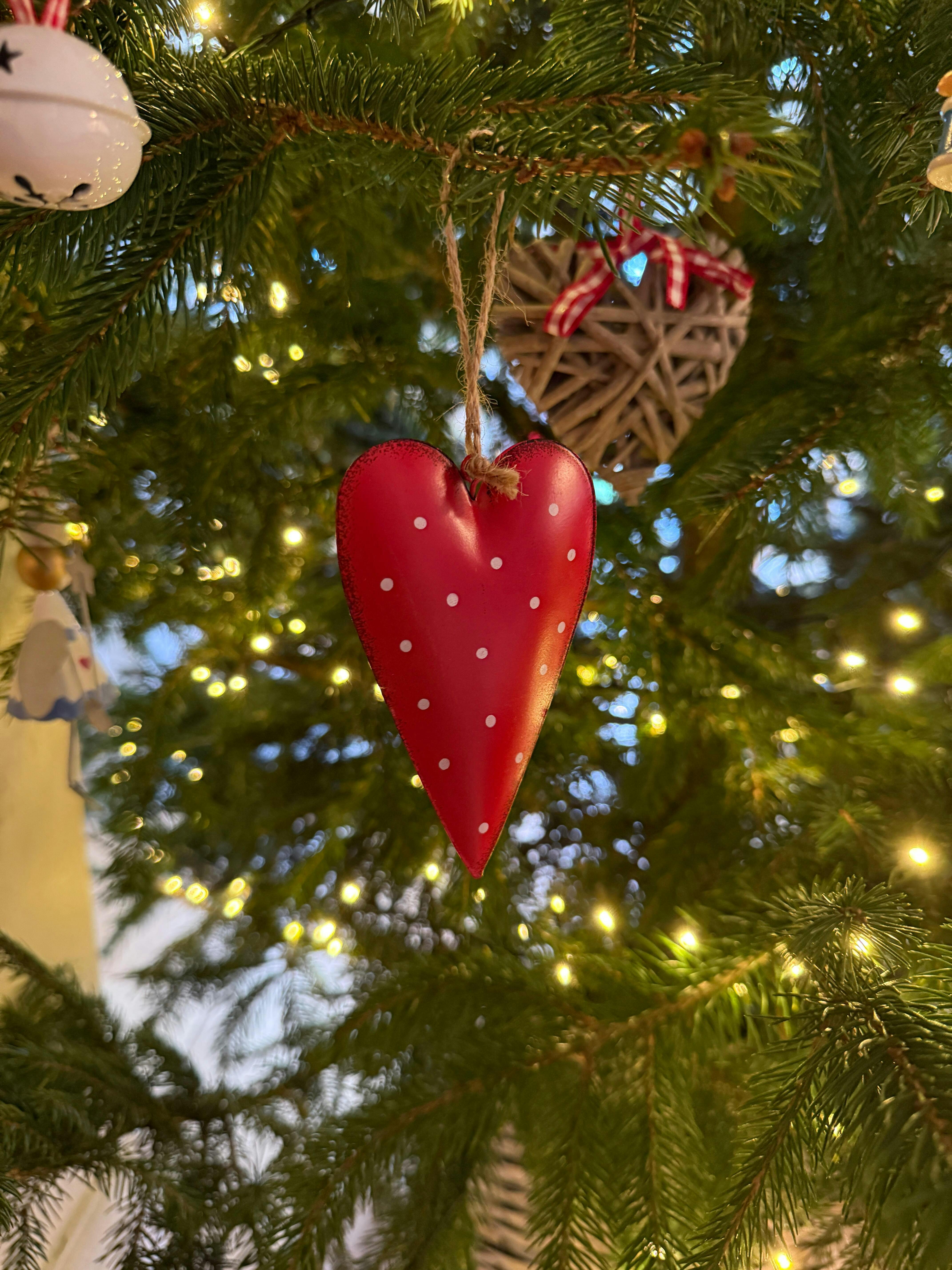 A red toned metal hanging heart with an overly distressed design and added white polka dot print to finish Sure to add a rustic charm to any tree display during the Christmas Period! Similar designs and colours are also available, Size is approx 11cm x 6.5cm