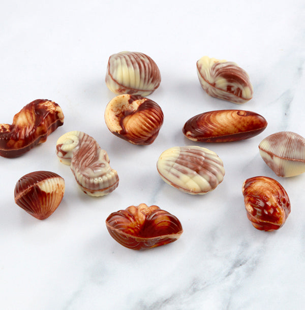 500g of Luxury Belgian Seashells. Made with luxury Belgian Chocolate with a Hazelnut Praline Filling