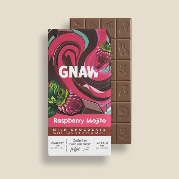 Gnaw's Raspberry Mojito milk chocolate bar combines the bright tanginess of fresh raspberries with a hint of mint and the bold rich creaminess of single-origin Colombian cocoa. A delightfully refreshing bar of milk chocolate.