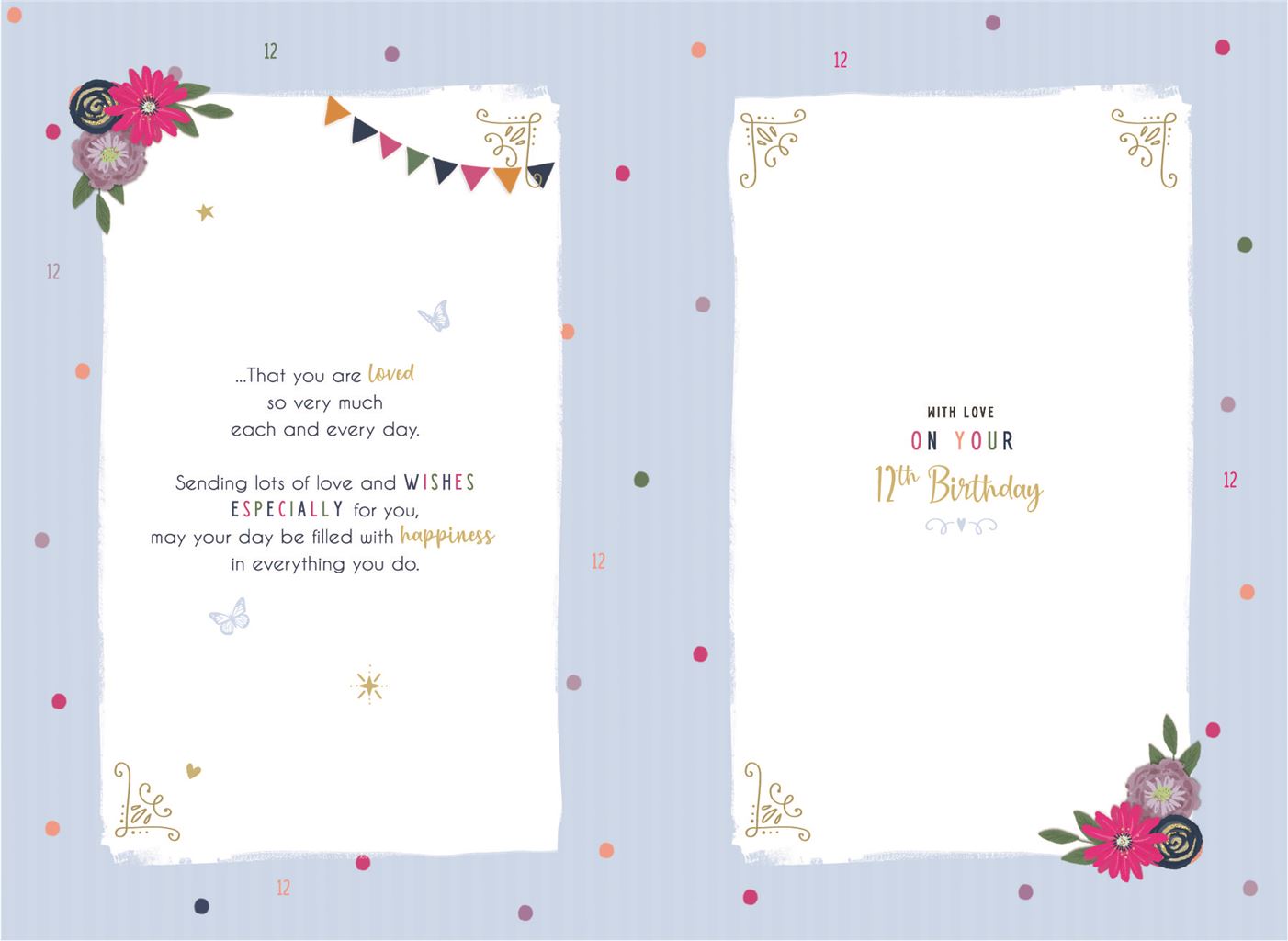 Verse: | For a lovely daughter on your 12th birthday your special day is here and it's the perfect time to say... That you are loved so very much each and every day. Sending lots of love and wishes especially for you, may your day be filled with happiness in everything you do. with love on your 12th birthday. |
