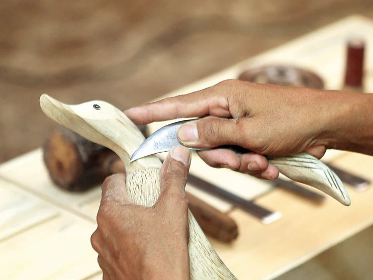 The DCUK Honey Baker and Honey Boot Ducklings are hand carved from earth-kind bamboo root and painted by hand making each one unique. They stand at approximately 18cm high and come with a randomly named cotton card tag.