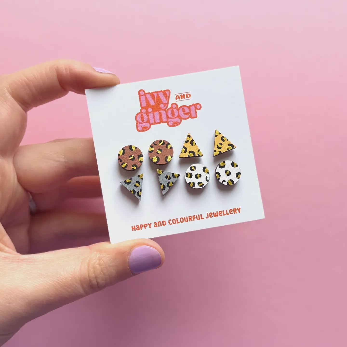 Featuring a mix of geometric triangles and classic circles in earthy brown, clean white, warm ochre, and soft grey, each stud has a delicate gold and black leopard print detail, all hand painted. - Made using FSC Certified wood - Hand painted - Surgical steel findings perfect for sensitive ears - Stud backs - Each stud measures 10mm - Handmade in the UK - Presented on a stylish backing card These bold and fun earrings are often used for gifting such as birthdays, Mother's day, best friend gifts, thank you gifts, teacher gifts, stocking fillers and more.