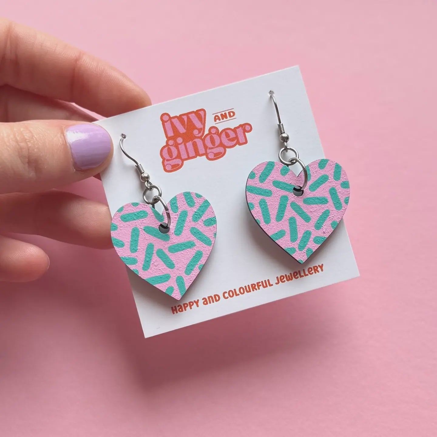 Large Pink & Mint Dash Print Heart Shaped Dangle Earrings