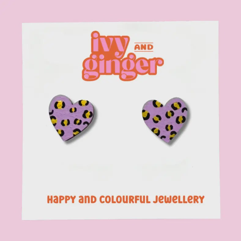 Hand painted lilac and gold leopard print heart shaped wooden earrings, the perfect statement piece to add a touch of fun and playfulness to your accessories collection. Measuring 15mm, these bright and colourful earrings are meticulously hand-painted to create a unique leopard print design using FSC certified wood. Crafted with surgical steel findings, these earrings are perfect for sensitive ears and ensure all-day comfort. Ideal as a gift for her, these fun, playful accessories are perfect for anyone who loves to showcase their unique style. These vibrant and stylish earrings are the perfect accessory to complete your look, sure to become your go-to for any occasion. Every pair of earrings comes attached to a stylish backing card. These earrings are often used for gifting such as birthdays, best friend gifts, thank you gifts and more.
