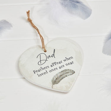 GREY FEATHER DAD MEMORY HEART HANGER WATERCOLOUR CERAMIC