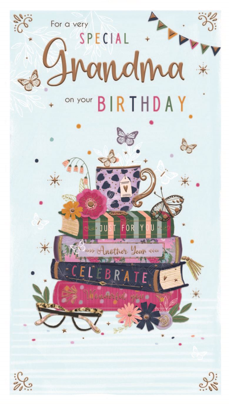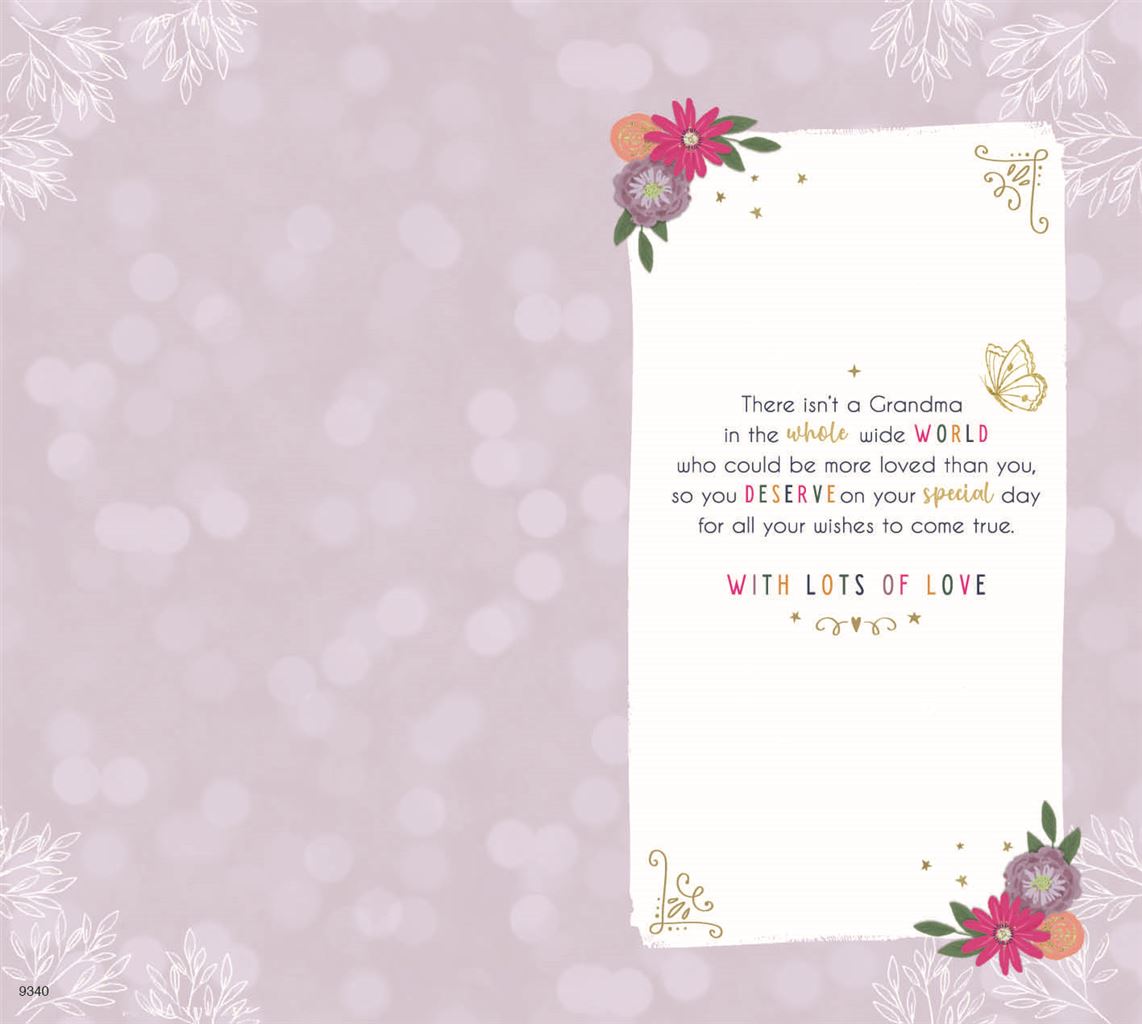 Verse: For a very special grandma on your birthday There isn't a grandma in the whole wide world who could be more loved than you, so you deserve on your special day for all your wishes to come true. With lots of love.