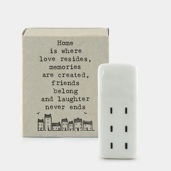 This tiny porcelain house ornament is presented in a craft matchbox with the sentiment 'Home is where love resides, memories are created, friends belong and laughter never ends'.