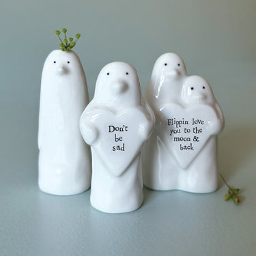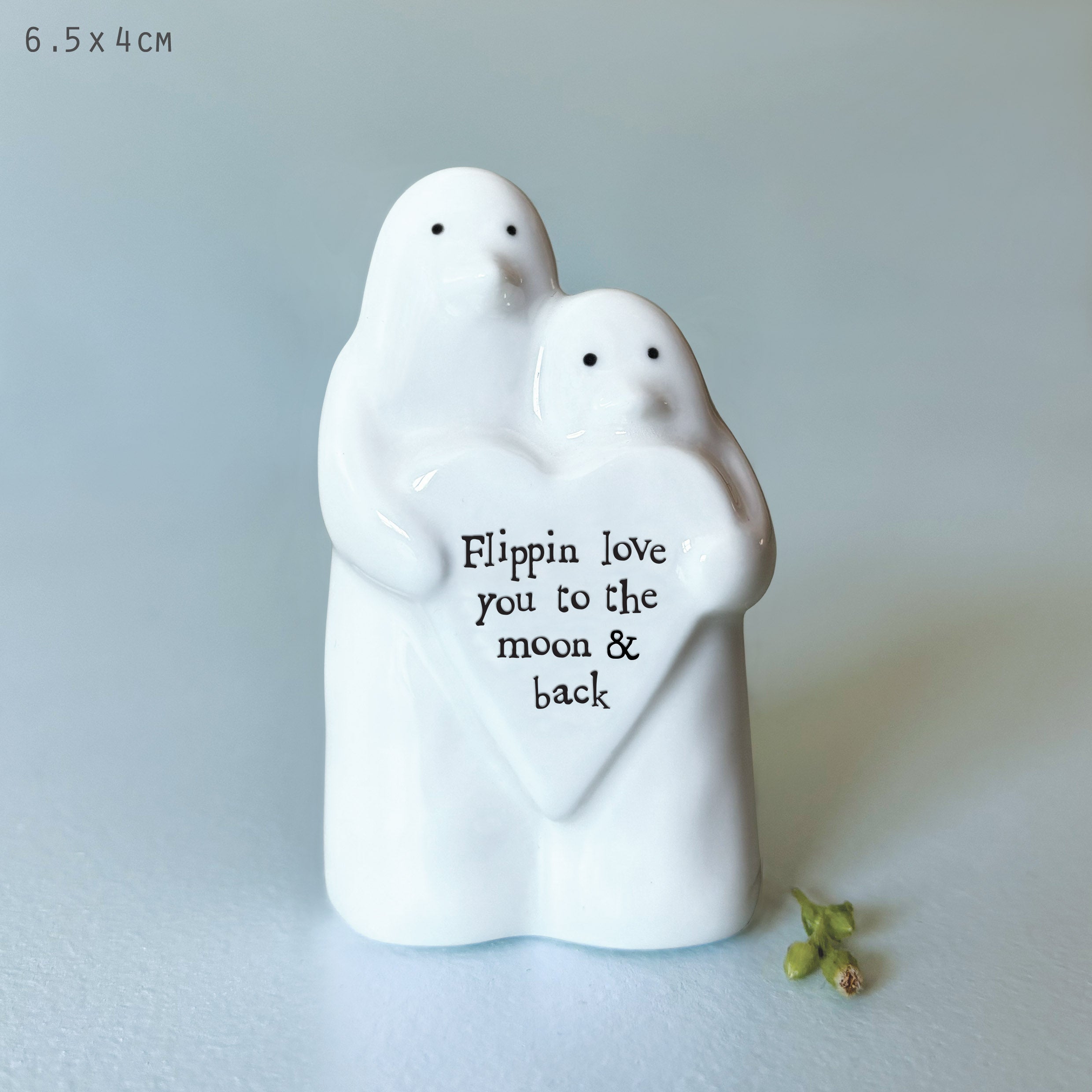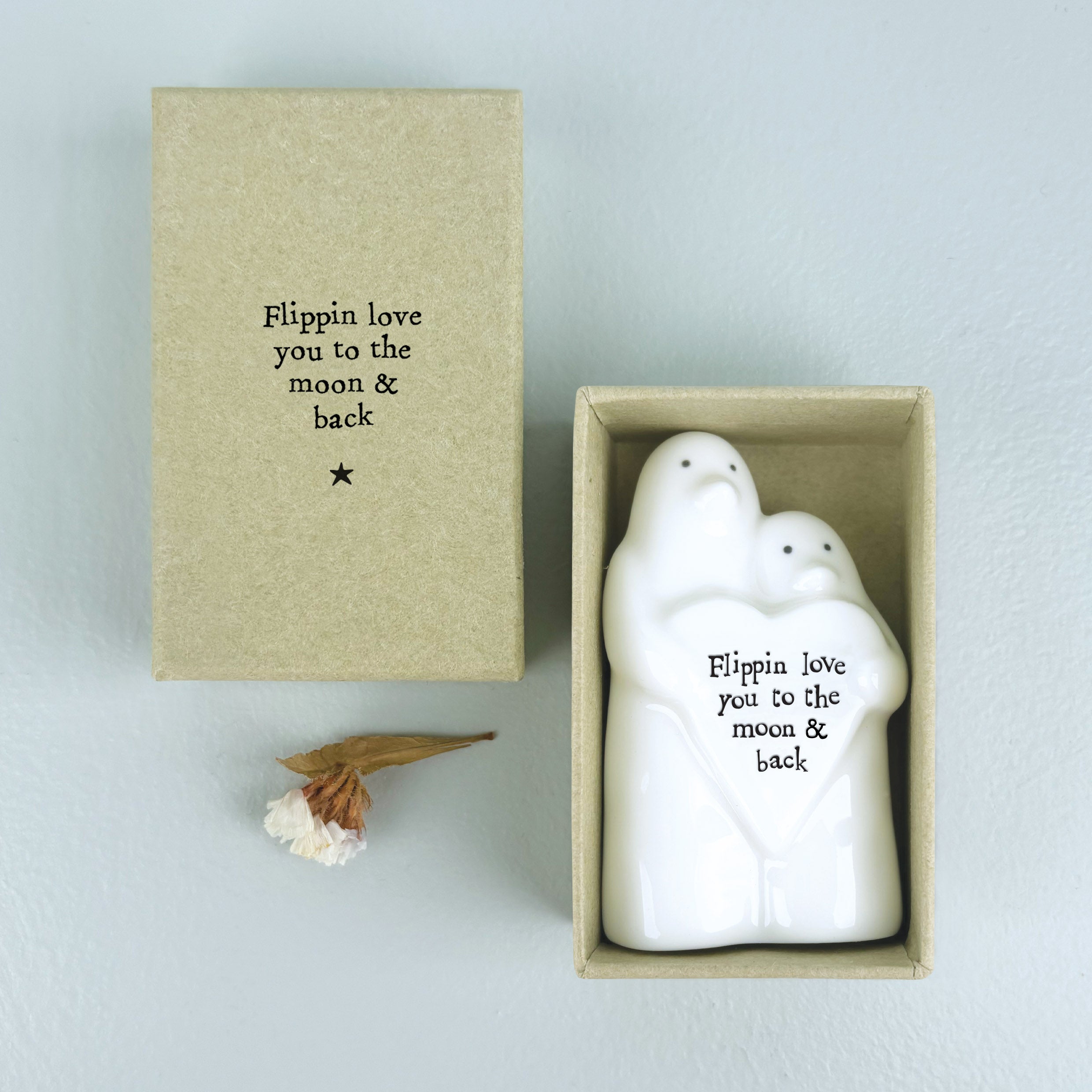 Remind them how much you love them with this lovely little trinket. Featuring two porcelain penguins holding a love heart containing the engraved wording ‘Flippin love you to the moon & back’. These cuddling little cuties make a fantastic gift sure to bring a smile.