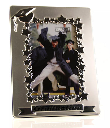 A quality two tone photo frame, the photo frame has a satin silver finish. Along the bottom of the frame within a scroll style design is the word 'Graduation' etched in black. A shiny star style design all around where the photo is displayed and to the top left is a graduation hat. Fantastic Quality frame from Shudehill Giftware