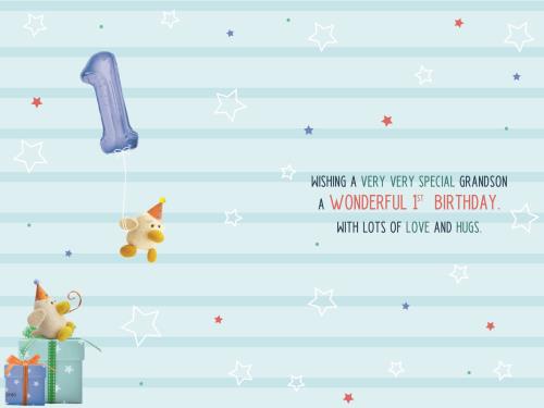 Verse: | For a precious grandson happy 1st birthday Wishing a very very special Grandson a wonderful 1st Birthday. With lots of love and hugs |