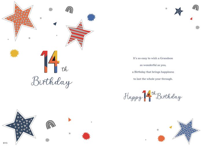 Verse: | To a wonderful grandson 14 today 14th birthday It's so easy to wish a grandson as wonderful as you, a birthday that brings that brings happiness to last the whole year through |