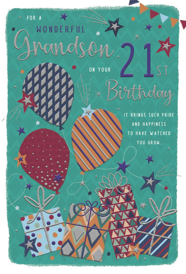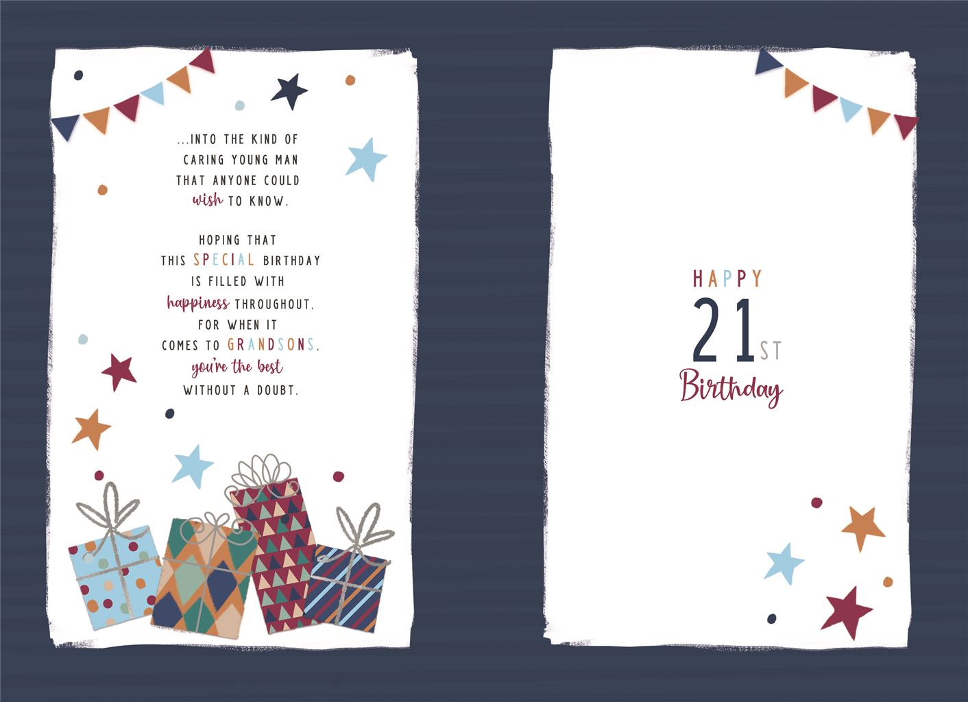 Verse: | It brings such pride and happiness to have watched you grow... into the kind of caring young man that anyone could wish to know. Hoping that this special birthday is filled with happiness throughout. For when it comes to Grandsons, you're the best without a doubt. Happy 21st Birthday |