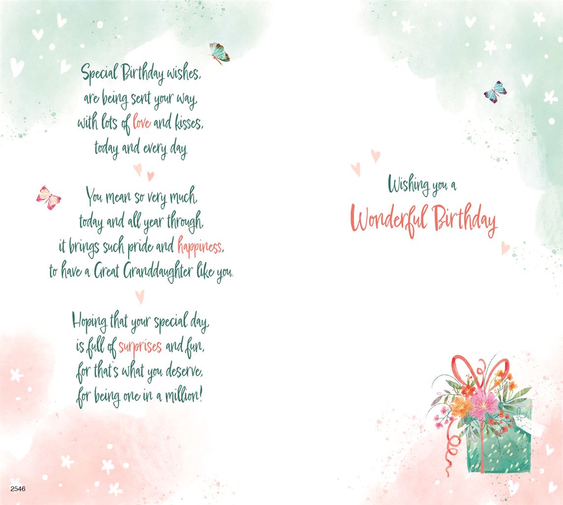 Verse: For a lovely Great Granddaughter On your Birthday Special Birthday wishes, are being sent your way, with lots of love and kisses, today and every day You mean so very much, today and all year through, it brings such pride and happiness, to have a Great Granddaughter like you. Hoping that your special day, is full of surprises and fun, for that’s what you deserve, for being one in a million! Wishing you a Wonderful Birthday
