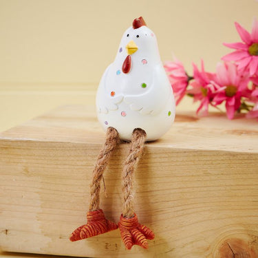 CHICKEN SHELF SITTER WHITE SPOTTY CERAMIC WITH STRING LEGS