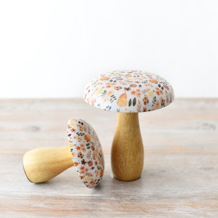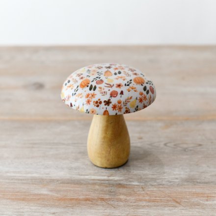 An enchanting mango wood mushroom adorned with a glazed top and autumnal pattern.