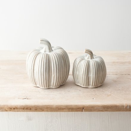 A rustic ceramic pumpkin ornament with a unique ribbed finish and natural glaze. Size 9 x 9.5cm