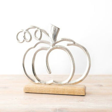 A chic metal pumpkin decoration set upon a rustic wooden base. Size 25 x 22cm