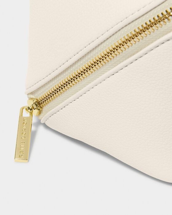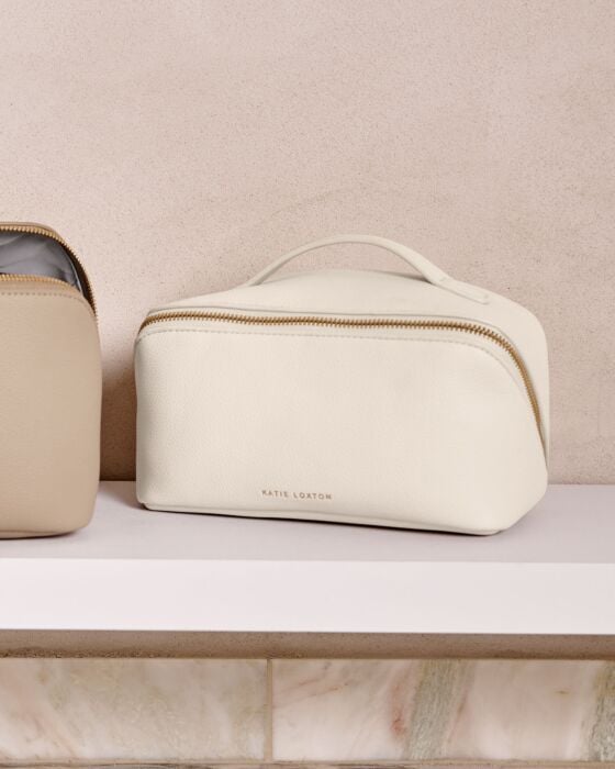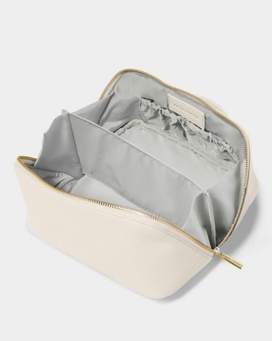Level up your get-ready routine with our Medium Makeup And Wash Bag in Off White. Its zip-around closure allows effortless access to your belongings, while its wipeable lining means there's no need to worry about spillages. Designed for makeup enthusiasts, this bag lays flat on any surface, revealing centre dividers and pockets for seamless organisation. It's the perfect blend of style and function.