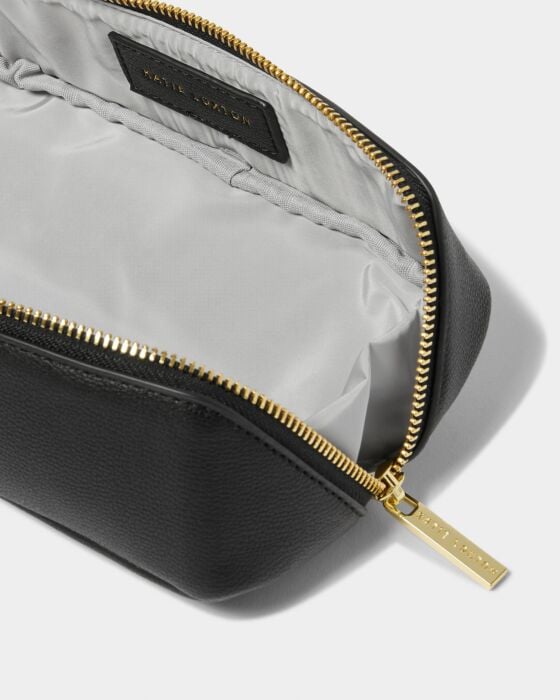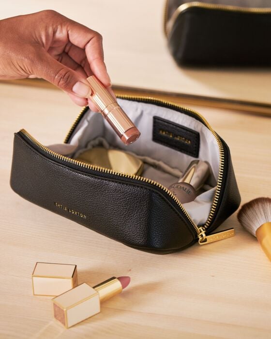 Level up your get-ready routine with Katie Loxton Small Makeup Bag in Black. Its zip-around closure allows it to fully open and lay flat on any surface, providing easy access to cosmetics. Plus, with its wipeable lining, there's no need to worry about spillages. This bag is every makeup enthusiast's dream!