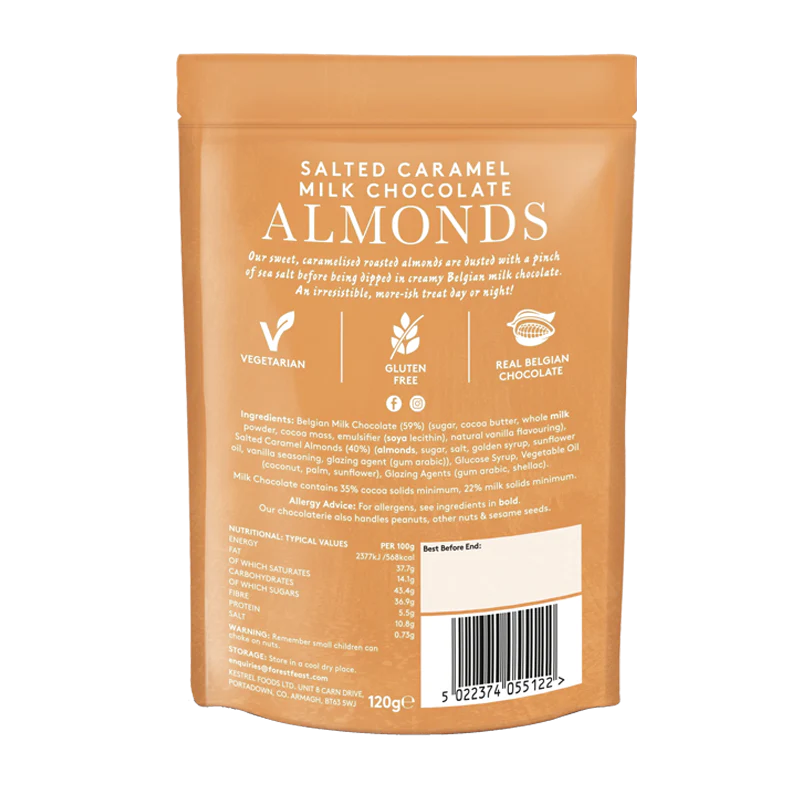 Forest Feast Salted Caramel Milk Chocolate Almonds – Crunchy almonds coated in smooth milk chocolate with a touch of salted caramel.