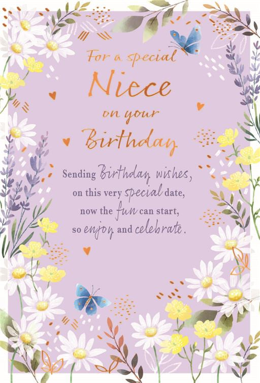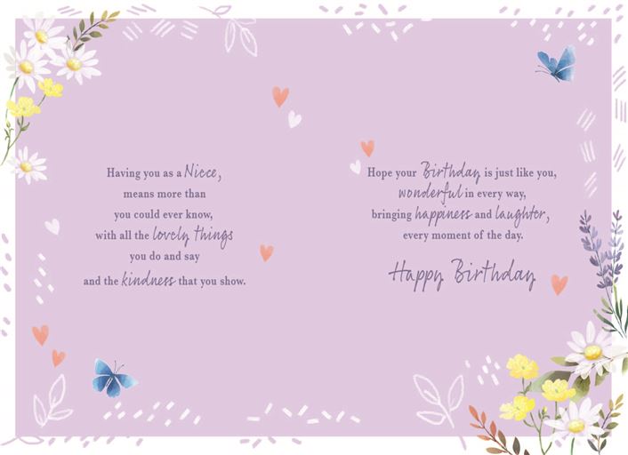 | Verse: | Having you as a niece, means more than you could ever know, with all the lovely things you do and say and the kindness that you show. Hope your birthday is just like you, wonderful in every way, bringing happiness and laughter, every moment of th day. Happy Birthday |