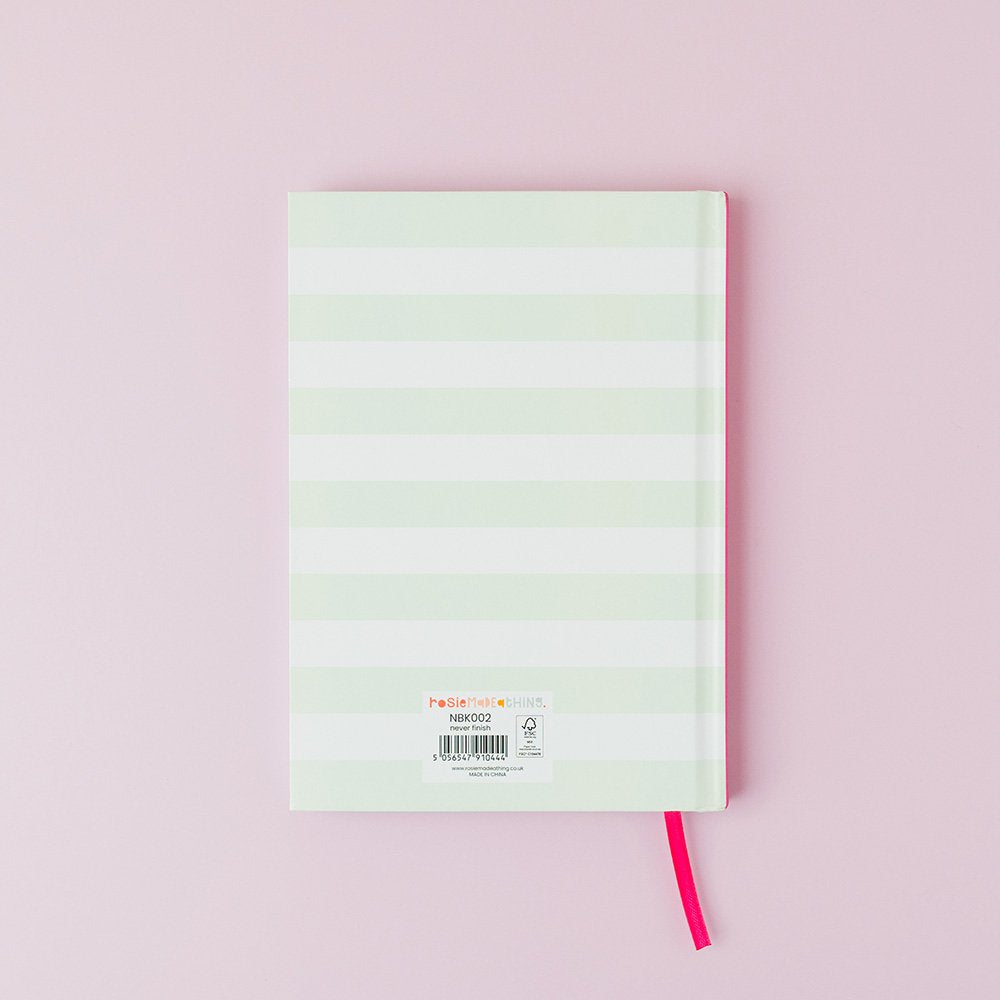 Never finish, A5 hardback notebook, fun, lined notebook for scribbles and doodles. Lined pages, with ribbon marker.