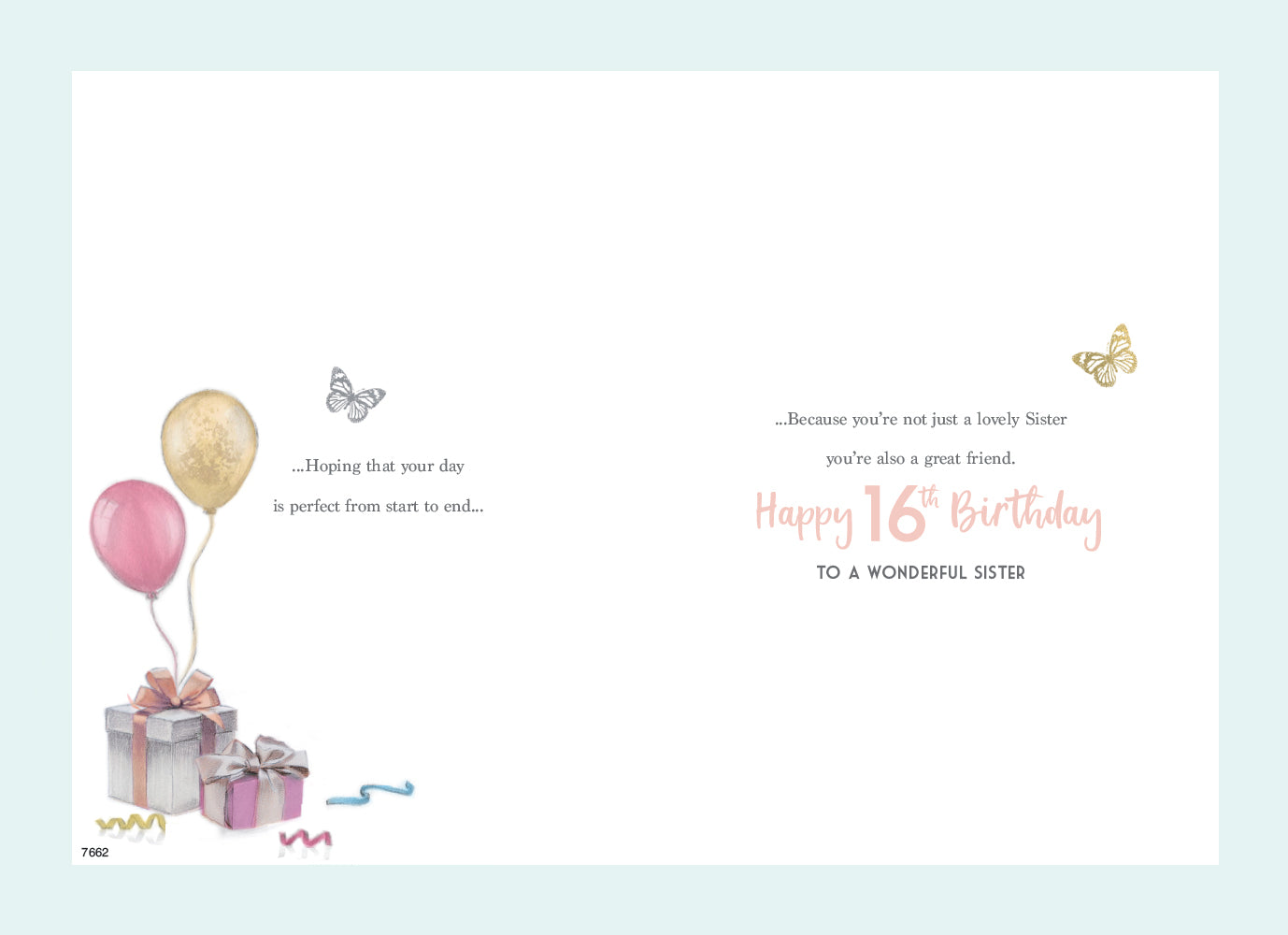 Inside reads: ...Hoping that your day is perfect from start to end..., ...Because you're not just a lovely Sister you're also a great friend. Happy 16th Birthday To A wonderful Sister
