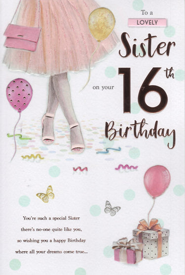 On the front the card reads: To a Lovely Sister on your 16th Birthday, You're such a special Sister there's no-one quite like you, so wishing you a happy Birthday where all your dreams come true...