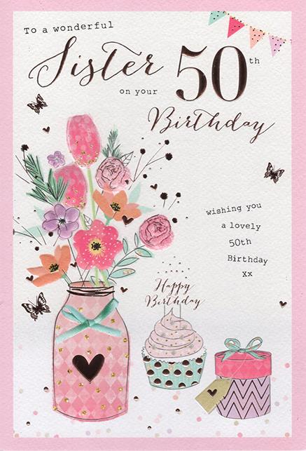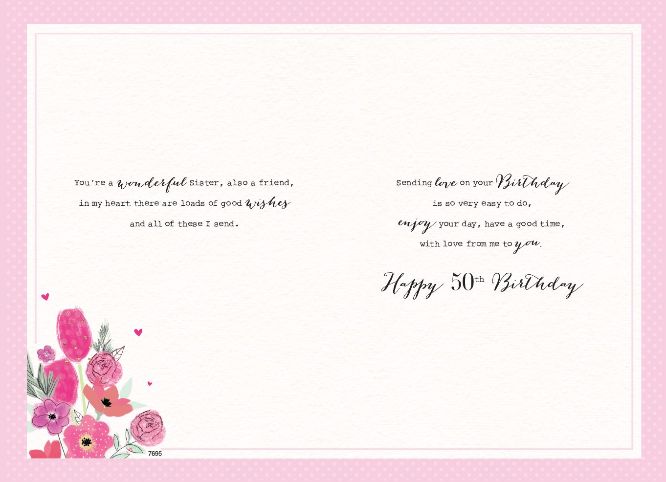Verse: | To a wonderful sister on your 50th birthday wishing you a lovely 50th birthday xx You're a wonderful sister, also a friend, in my heart there are lots of good wishes and all of these i send. Sending love on your birthday is very easy to do, enjoy your day, have a good time, with love from me to you. Happy 50th birthday. |