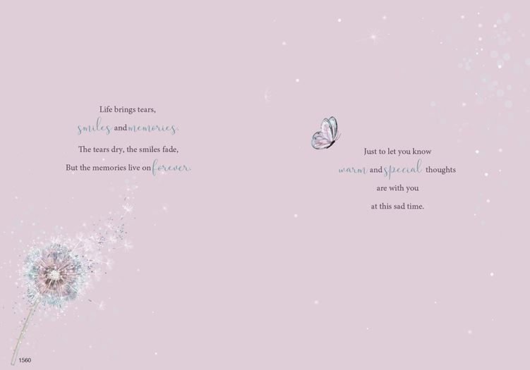 With deepest sympathy on the loss of your nan Life brings tears, smiles and memories. The tears dry, the smiles fade but the memories live on forever. Just to let you know warm and special thoughts are with you at this sad time.