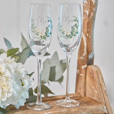 GLASS WEDDING MR & MRS CHAMPAGNE FLUTE SET IN CLEAR PVC GIFT BOX