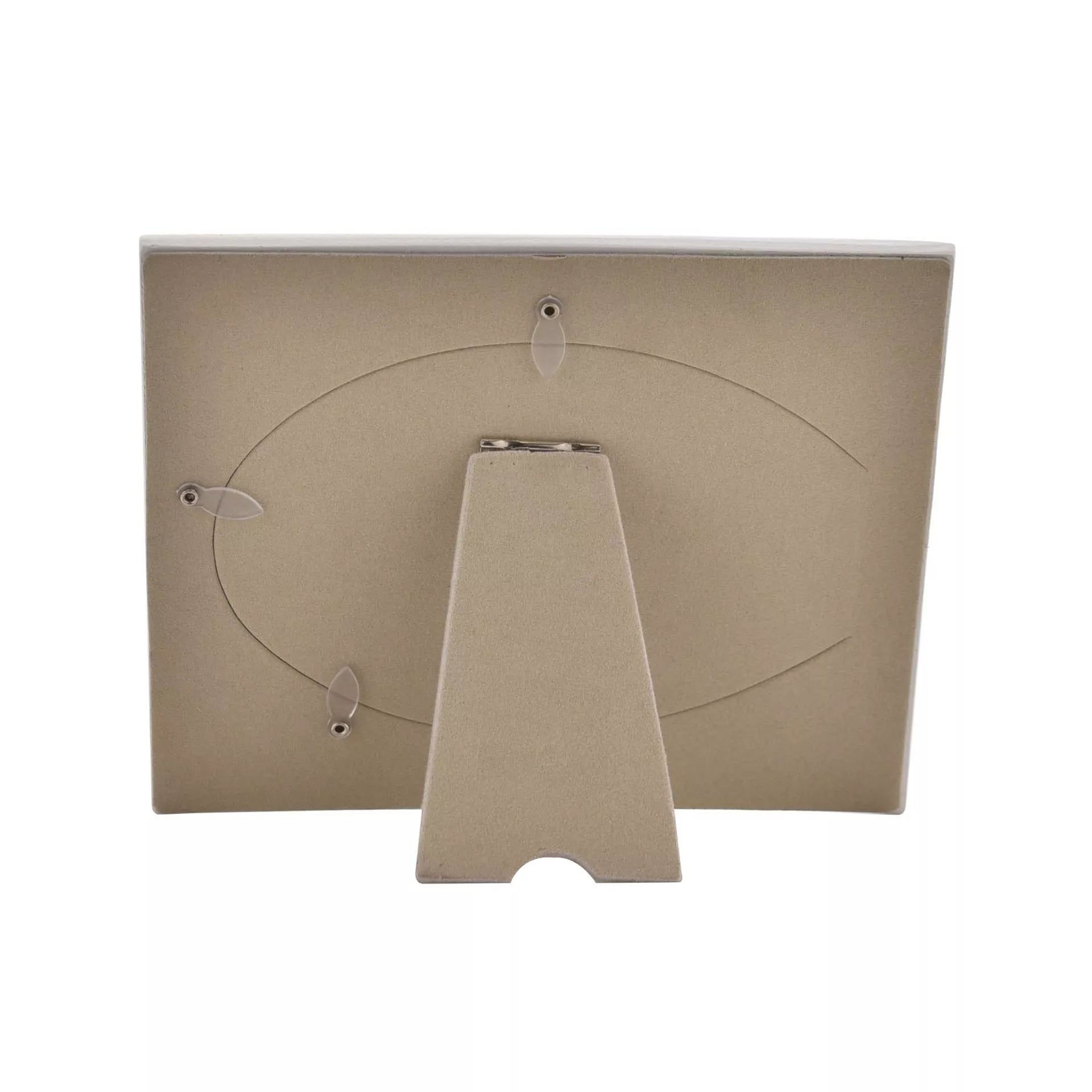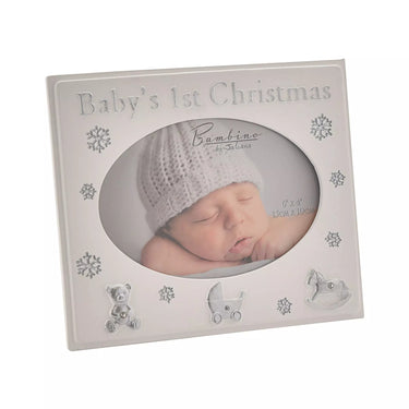 The resin frame features a snowy-white finish and oval, landscape aperture for freestanding display. It is finished with ‘Baby’s 1st Christmas’ decal in grey embossed lettering, crystal finish icons and debossed snowflake decoration.