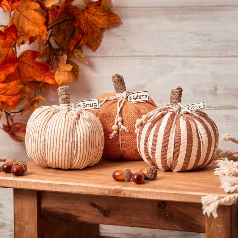 Bring a fun finishing touch to your home with the Langs Fabric Pumpkin with Hessian Stem. Available in a choice of 3 different designs. There is a thin striped pumpkin with the label ‘Snug’, a thick striped pumpkin with the label ‘Cosy’ and a solid orange pumpkin with the label ‘Autumn’. This listing is for 1 x pumpkin decoration. If you want a specific design, it must be written in the notes section of your order or one will be sent at random.