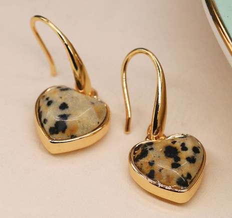 FAUX GOLD PLATED DALMATION JASPER EFFECT HEART DROP EARRINGS