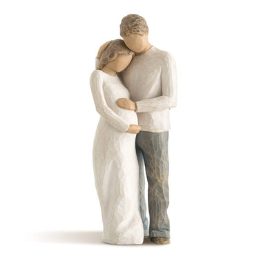 Willow Tree is an intimate line of figurative sculptures representing sentiments of love, closeness, healing, courage, hope...all the emotions we encounter in life. "I wanted to capture the time in your life when there's a lot of excitement, happiness, yet a big unknown. This piece connects the concepts of Home and Family - you are creating your own family - your own home..." - Susan Lordi. The item is made in cast stone and hand-painted with lead-free paint. Supplied in a branded gift box and a gift tag with sentiment 'Together, our family is home'. Not a toy or children's product. Intended for adults only.