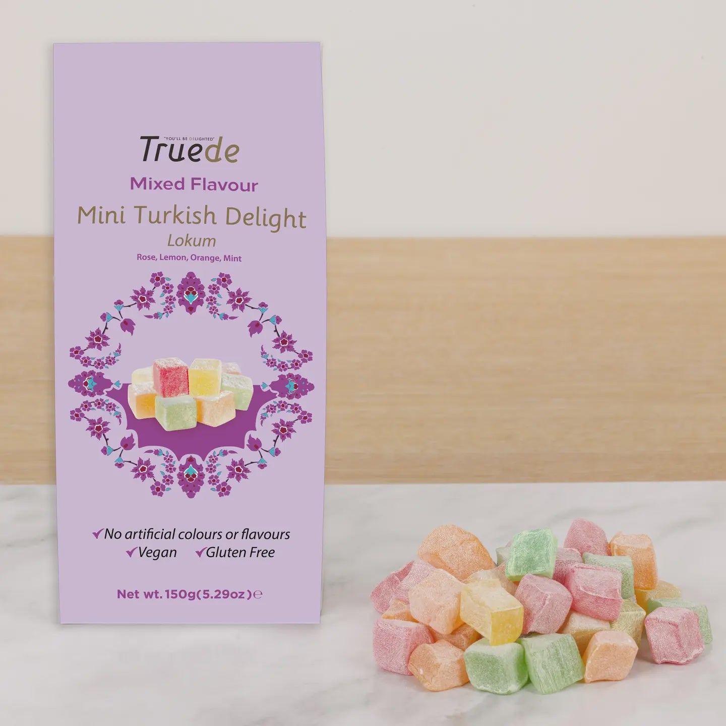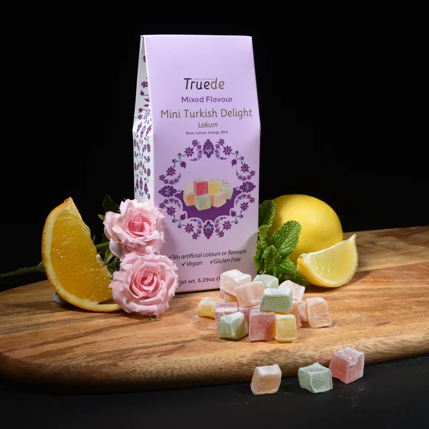 Presenting Truede's Mini Delights, now available in a convenient grab-and-go style pack for a truly delightful snacking experience. Handcrafted by skilled artisans in Istanbul, these bite-sized treats showcase a refreshing medley of rose, lemon, orange, and mint — a vibrant fusion of floral, citrus, and cool herbal notes.