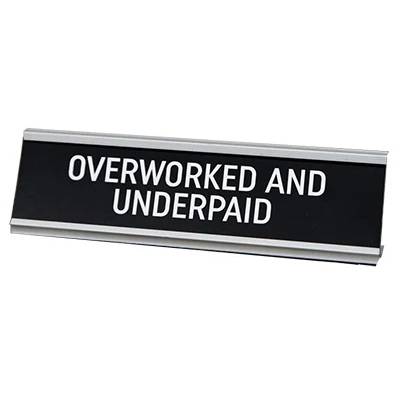 Let the grafter in your life know you feel their pain with this "Overworked And Underpaid" novelty desk plaque.