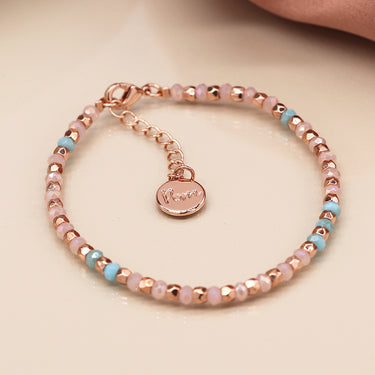 PINK/LILAC GLASS BEAD AND ROSE GOLD FACET BEAD BRACELET