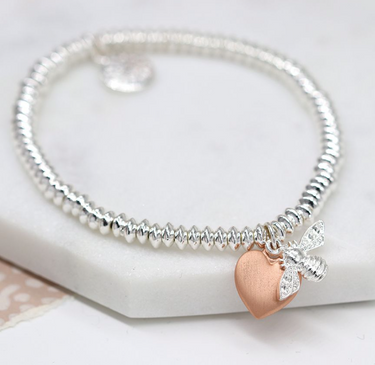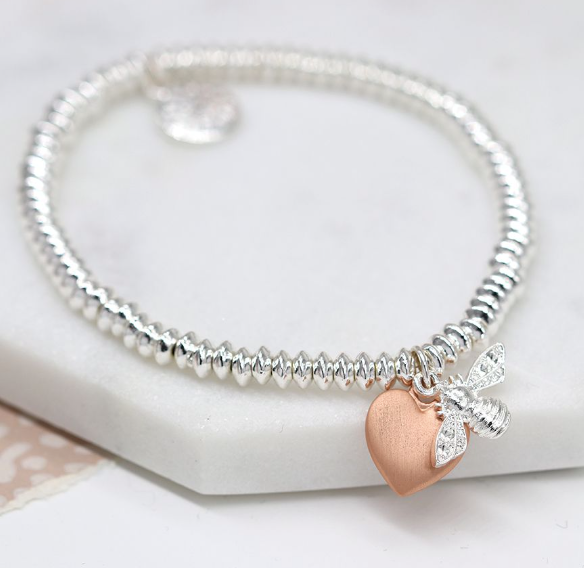SP OVAL BEAD BRACELET WITH SP BUMBLEBEE AND ROSE GOLD HEART